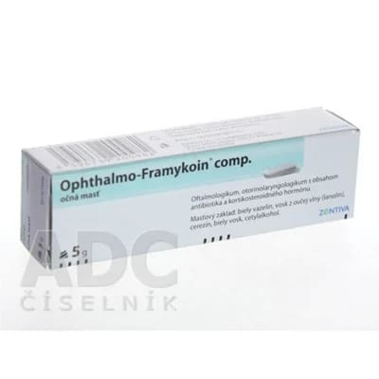 Глазная мазь «Офтальмо-Фрамикоин комп». Он содержит бацитрацин и неомицин, комбинацию антибиотиков широкого спектра действия, дополненную гидрокортизоном, кортикостероидным гормоном с противовоспалительным и противоаллергическим действием. Мазь предназначена для лечения тех заболеваний глаз, где, помимо инфекционного, значительно проявляется аллергический и воспалительный компонент.